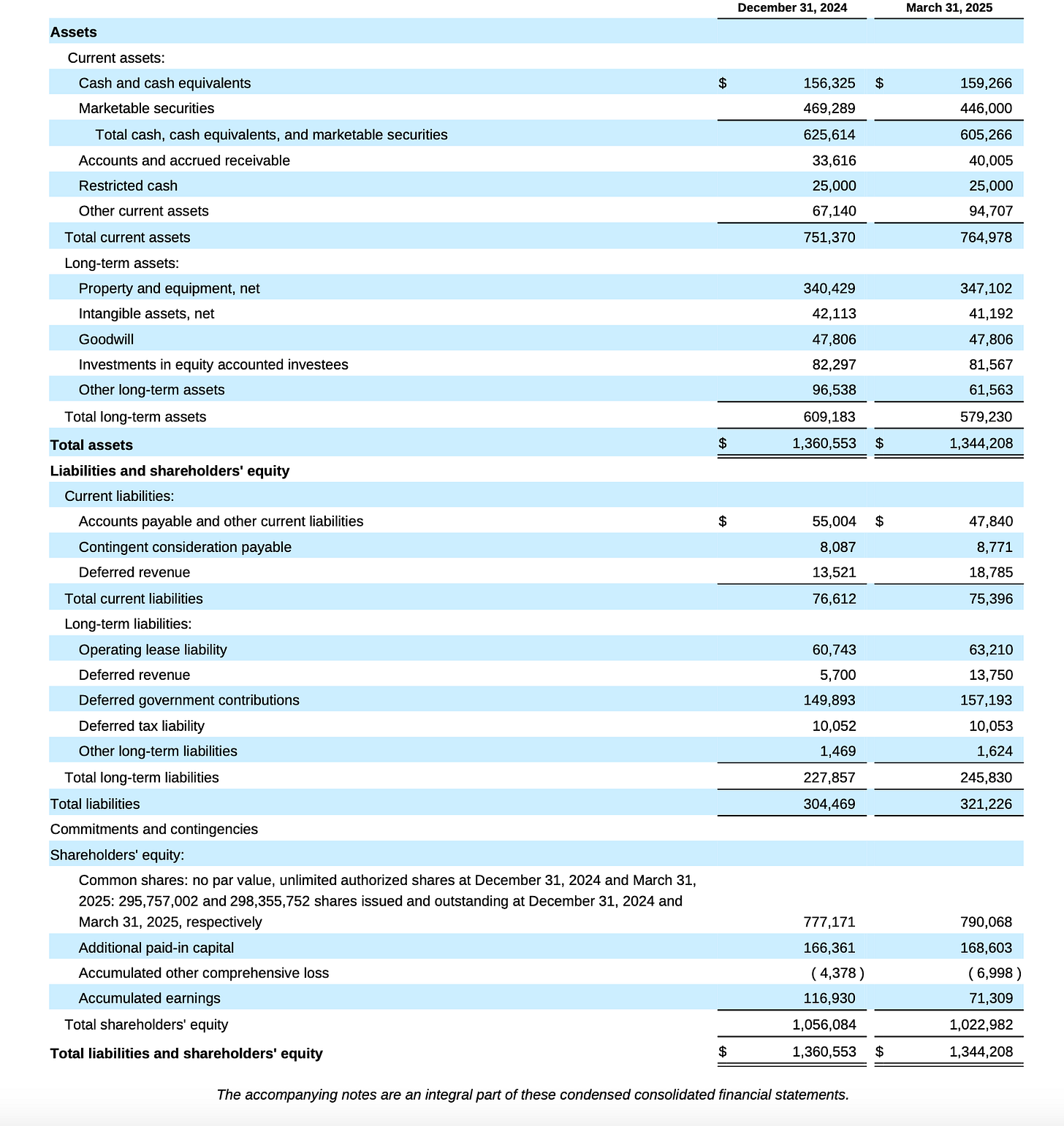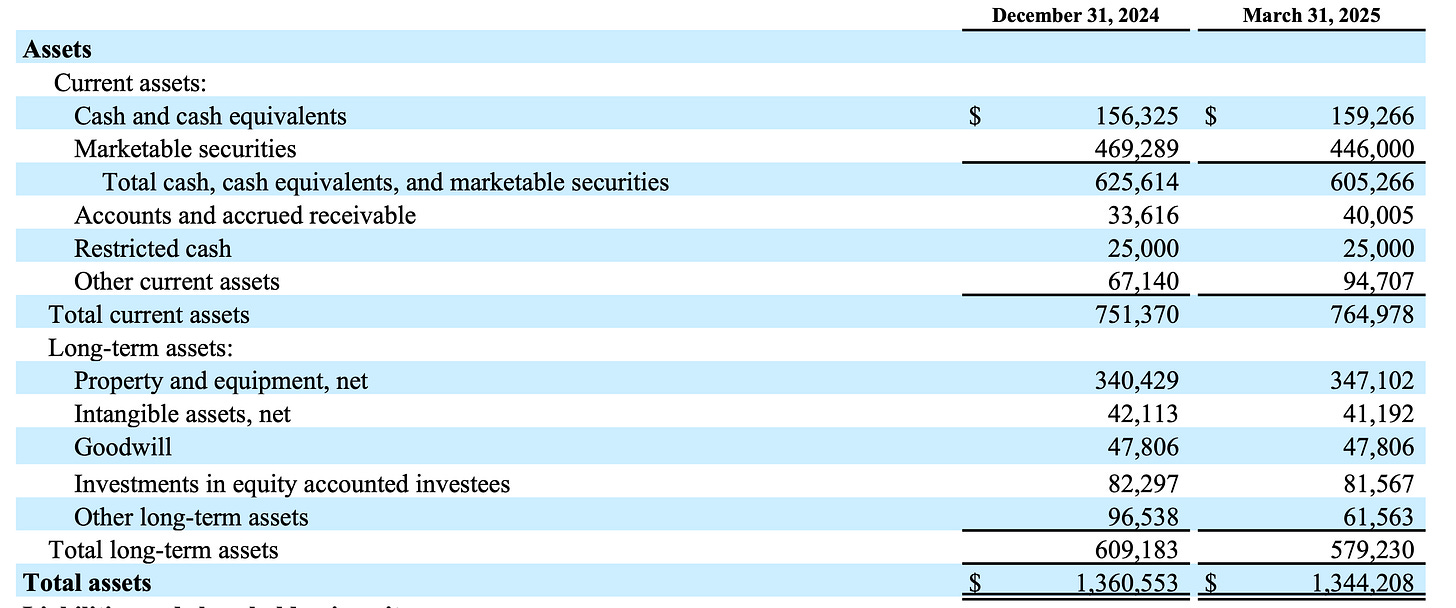 A primer trimestre de 2025, la compañía dispone de una caja $159m y unos marketeable securities (inversiones a corto plazo) de$446m. En suma, tendríamos así $605m en caja. Esto es muy llamativo cuando descubrimos que la compañía no dispone de deuda y los payables se compensan con los receivables. Lo más similar a deuda son las obligaciones de alquileres de algunas instalaciones, que en 2025 suman $63m anuales.