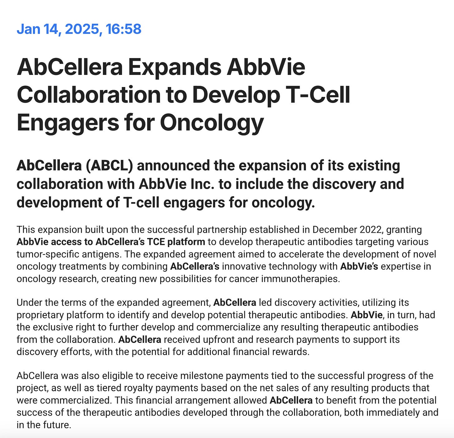 Diseñar estas "esposas moleculares" es extremadamente difícil. Necesitas el "agarre" perfecto para cada lado: lo suficientemente fuerte para unirlas, pero no tanto como para causar una reacción inmune descontrolada. La plataforma de AbCellera, que puede analizar millones y millones de anticuerpos diferentes, es ideal para encontrar las combinaciones óptimas de "brazos" para crear T-cell engagers que sean a la vez potentes y seguros. Recientemente, han anunciado la expansión de su colaboración con la farmacéutica AbbVie precisamente para desarrollar este tipo de fármacos contra el cáncer, lo que creo que habla bien a las claras del poder de “intangibles” que tiene Abcellera gracias a su tecnología.