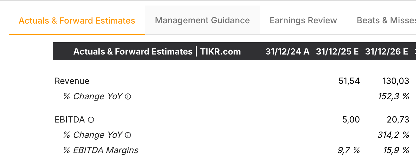 Si comparamos lo realizado con las estimaciones actuales, podemos ver como quedan notablemente por encima. En nuestro modelo recogemos $68m de ingresos en 2025, por los $51m del consenso. El EBITDA también es muy superior ($9,2m vs $5m), sobre todo a 2026, donde los $20m del consenso se transforman en casi $34m en nuestro modelo.