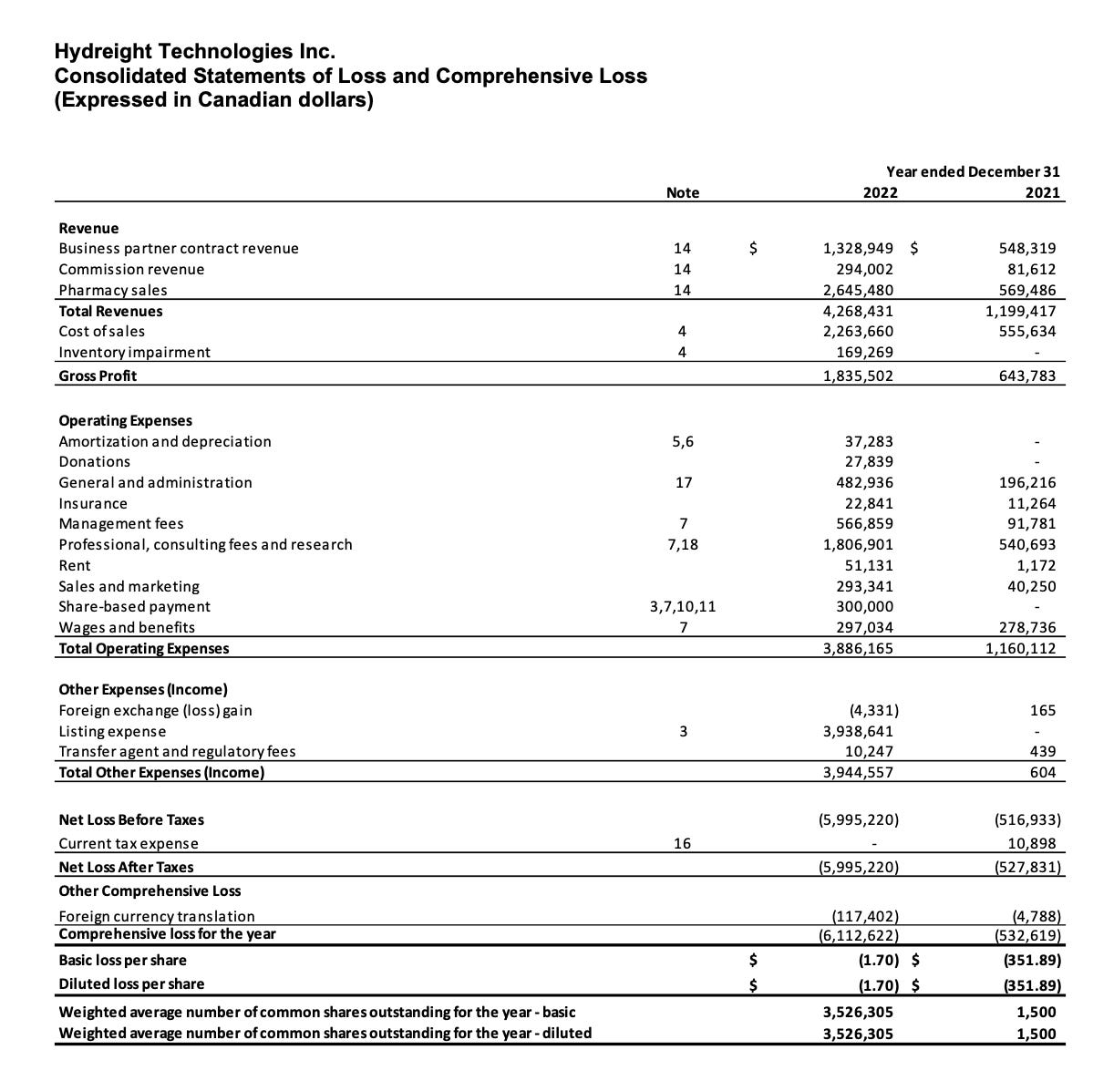 Bajo estas dos verticales ya conocidas, Hydreight comienza a operar de manera satisfactoria. Así, podemos ver en la imagen de abajo como durante 2022 la compañía aumenta sus ingresos en más de un 100%, segmentando estos en Business partner contract revenue, o lo que es lo mismo, contratos anuales con los profesionales (recordemos los 3 mil dólares al año), Comission revenue o porcentaje sobre las consultas realizadas (recordemos la cifra del 10%) y Pharmacy sales, que supone el del total de los ingresos generados por las farmacias asociadas, para posteriormente y a través del “Cost of sales” quedarse únicamente con el margen correspondiente.