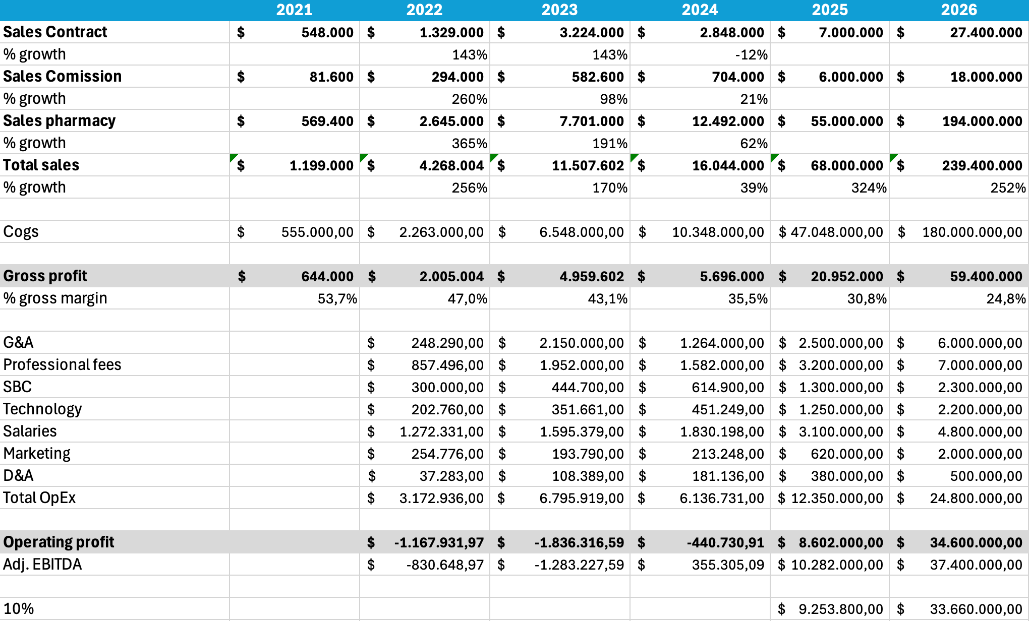 El mix de segmentos se completará de manera “aleatoria” y por indicios históricos, ya que no sabemos qué porcentaje de cada fuente de ingresos está siendo tomada. Si sabemos, al contrario, que contamos con precios de subscripción anual (recurrentes), porcentaje sobre servicios y porcentaje sobre farmacias, los cuáles pueden ser mejorados por la reciente adquisición.