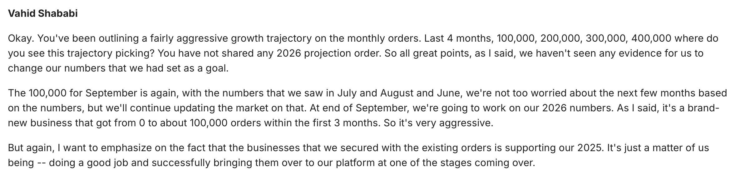 Para llegar a una estimación de ingresos la compañía nos ha dado diferentes datos: creen que pueden alcanzar los 1,3 millones de pedidos en 2025, finalizando en diciembre de este mismo año con un run rate de 400 mil.