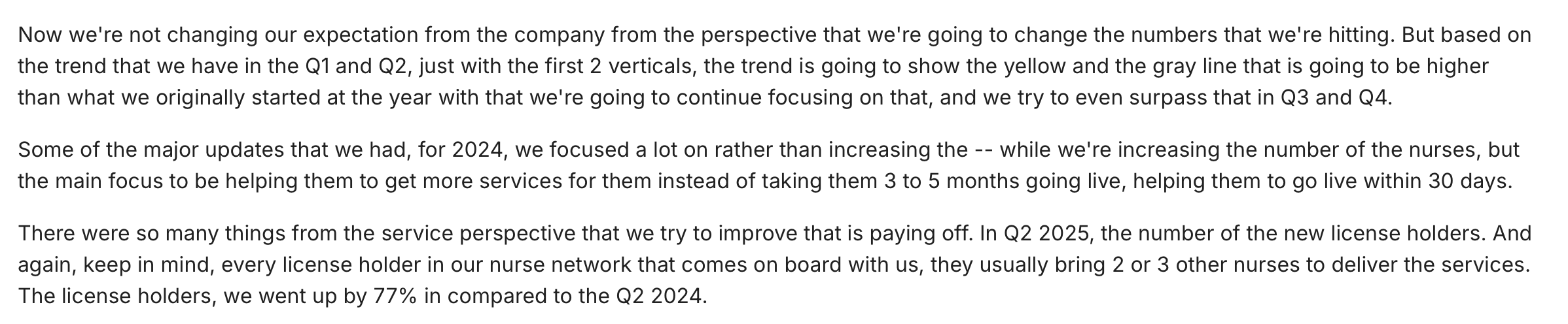 Al respecto de lo anteriormente señalado, la directiva comentó que el decrecimiento en Contract sales se debió a ajustes en deferred revenue recognition para contratos white-label y suscripciones, priorizando ramp-up orgánico. Destacó que esto fue temporal y beneficiaría a la rentabilidad a largo plazo. Añadió de igual manera que el enfoque durante el año fue el ayudar a las enfermeras a generar más servicios en lugar de solo onboardings masivos (nuevas altas de enfermeras sin volumen de servicios asociadas a ellas), lo que impactó el segmento Contracts pero impulsó Commissions.