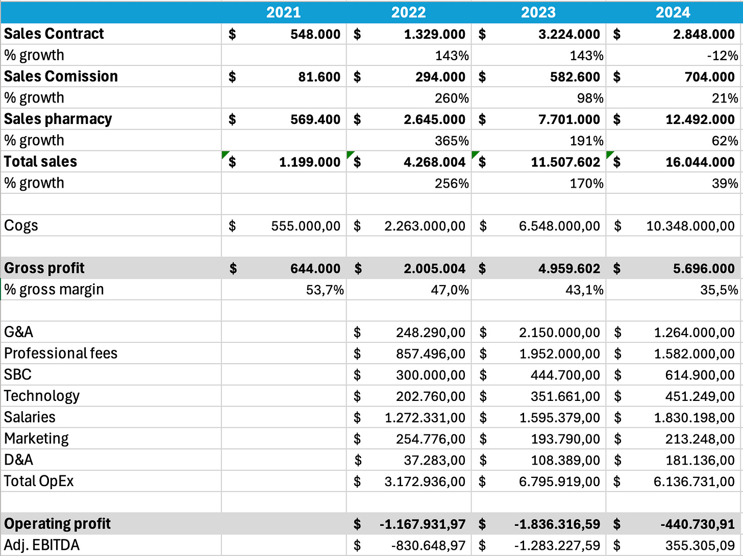A pesar del decrecimiento en ese segmento, la compañía logra gestionar bien sus recursos y alcanza por primera vez un EBITDA ajustado positivo, algo muy interesante ya que nos da a entender que está siendo capaz de escalar sus operaciones. En la imagen de abajo, de elaboración propia, se puede ver el panorama general de la compañía en los últimos 4 años.