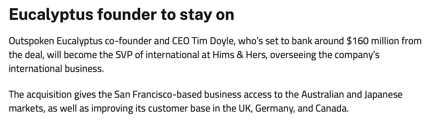 Un detalle que en mi opinión no ha recibido suficiente atención es el siguiente: Tim Doyle, el fundador y CEO de Eucalyptus, se embolsa aproximadamente $160m con esta transacción (según prensa australiana) y pasa a ser SVP Internacional de Hims. Que el fundador haya cobrado ya su principal upside no invalida su implicación futura, pero su incentivo marginal durante los próximos cuatro años es definitivamente menor a los ya logrados. Merece tenerlo en mente cuando evaluemos la calidad de la integración.