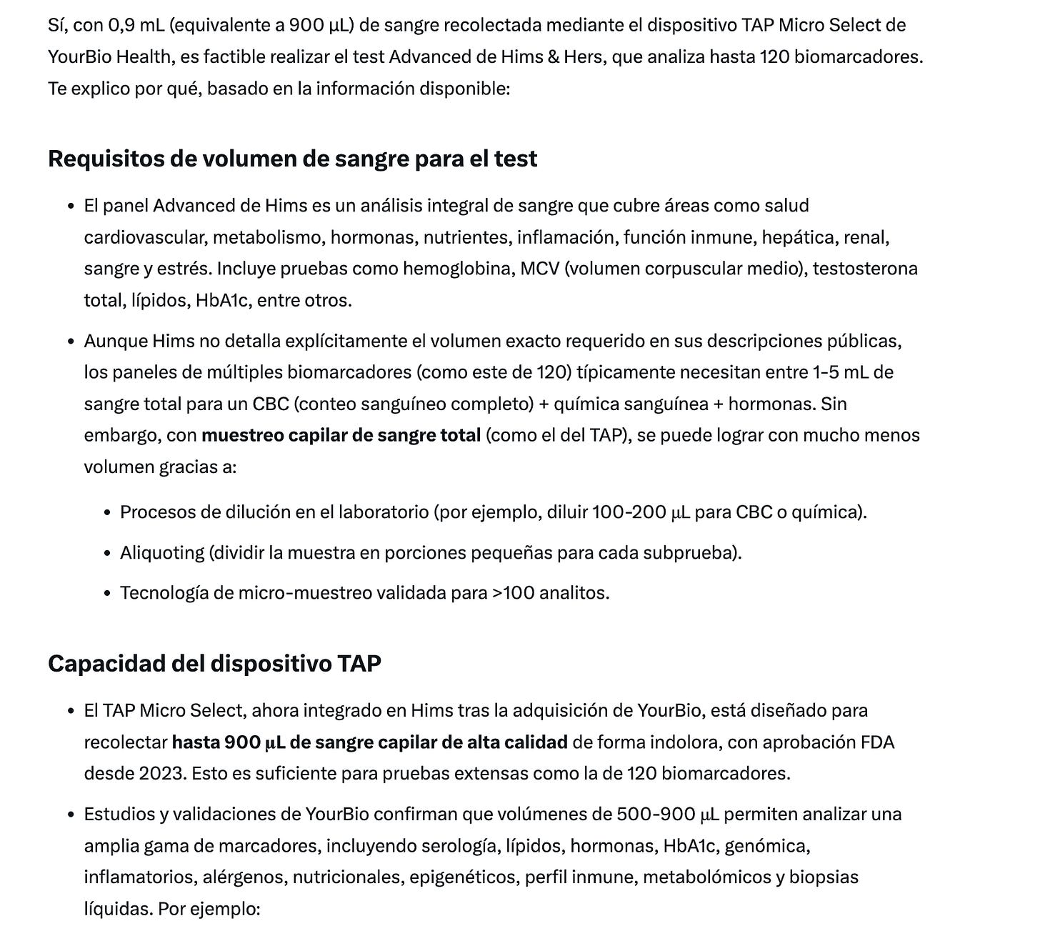 En relación a esto, y a partir de una descripción completa de marcadores ofrecidos por Hims y especificaciones del dispositivo, la IA me devuelve este mensaje. Recalcar que esto se confirma en tres plataformas diferentes como Gemini (Google), Grok (X) y ChatGPT (OpenAI.