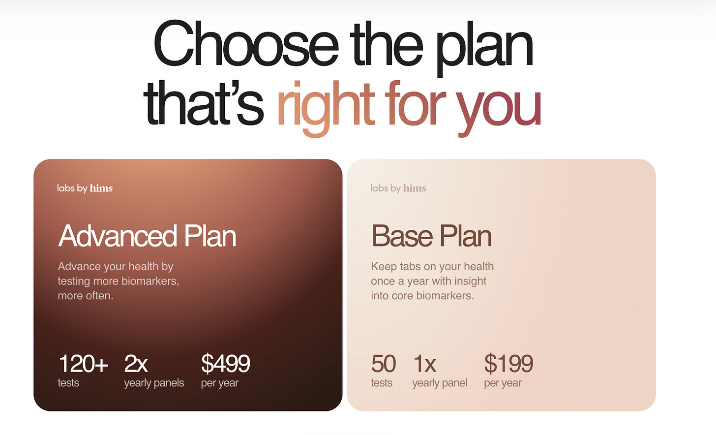 Podríamos decir que ambos dispositivos están a la par en cuanto a experiencia del usuario y eficacia. Así, lo que prima es el control sobre esa cadena de valor. En el Q3 de 2025 Andrew Dudum, CEO de Hims, comunicó que, a pesar de los precios actuales del servicio de Labs (499$ al año para el Advanced y 199$ al año para el Base - ver foto adjunta debajo-), a largo plazo la idea era que estos planes redujesen su coste a una mínima fracción, pudiendo llegar a ser gratuitos a medio-largo plazo.
