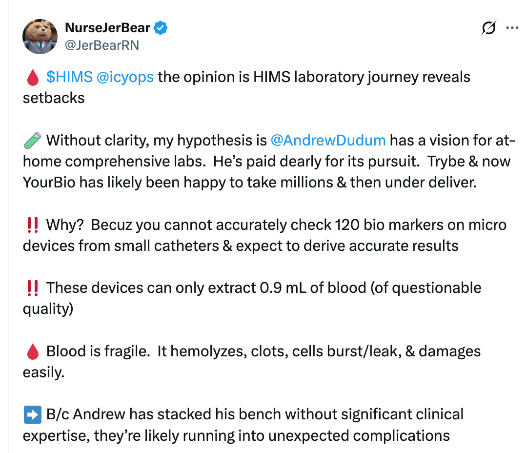 Andrew Dudum (CEO de Hims) comprende que el mundo de los servicios de análisis de laboratorio, del cual dependen empresas enteras, no es un negocio rentable por sí mismo, sino una “puerta de entrada estratégica”. Por naturaleza, este diagnóstico es un servicio commodity con pocas barreras de entrada reales.