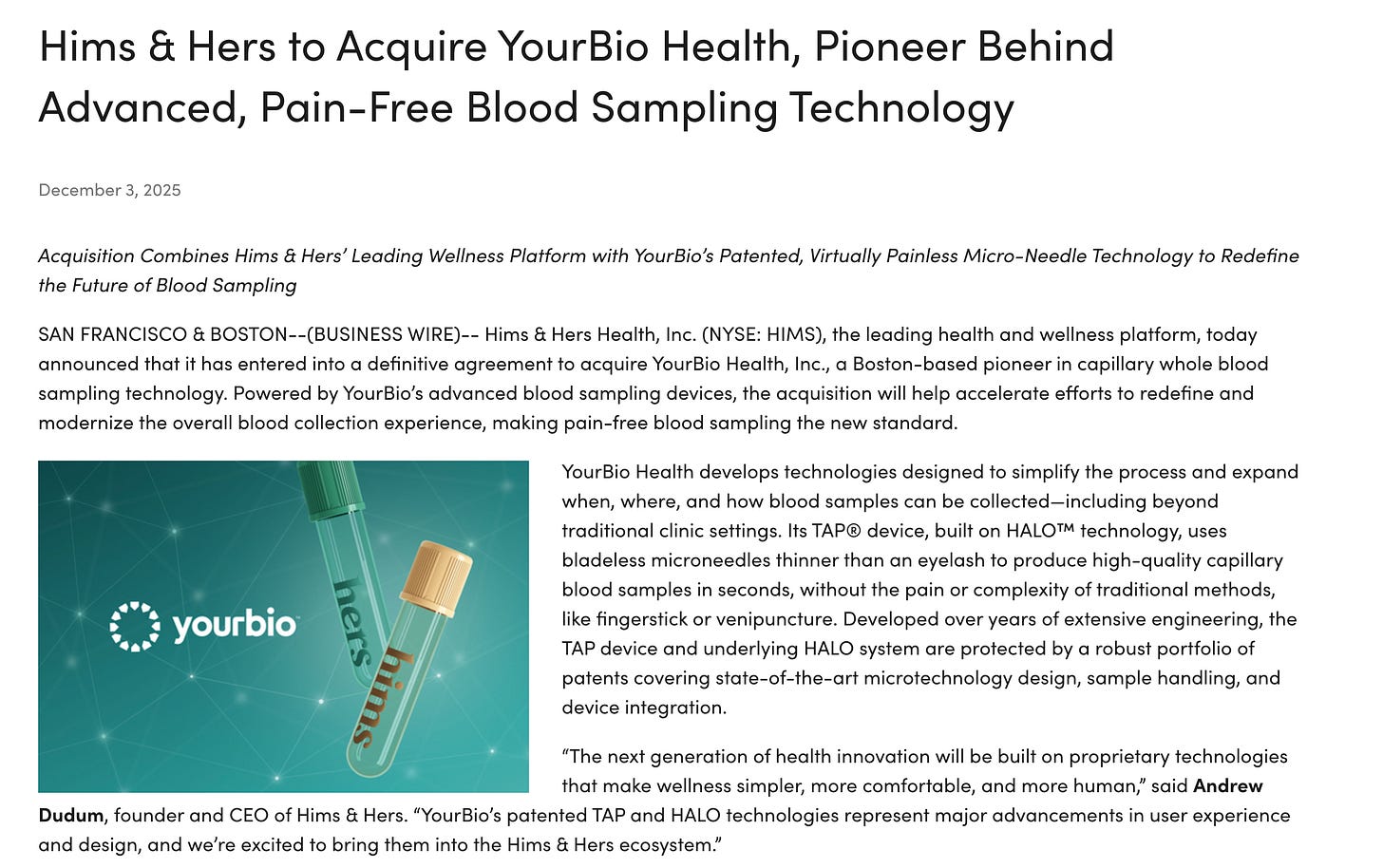 Para resumirlo brevemente, la compañía adquiría Yourbio Health, una empresa de tecnología de salud conocida por desarrollar el Dispositivo TAP®, una solución patentada de micromuestreo de sangre que permite la recolección de muestras de sangre capilar de alta calidad de forma prácticamente indolora y sencilla en el domicilio del paciente.