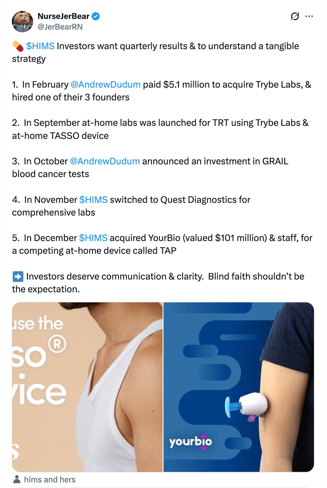 La solución estratégica es la integración vertical completa de la cadena de suministro del diagnóstico. La adquisición de un dispositivo propio (como la tecnología YourBio TAP) permite a Hims asegurar su entrada al vasto mercado de población no diagnosticada de una manera que cumple con sus promesa Best in Class y Customer Experience. Y es que a pesar de que son adquisiciones que en el futuro aportarán 0 ingresos de manera directa, se dirigen al centro del objetivo perseguido: