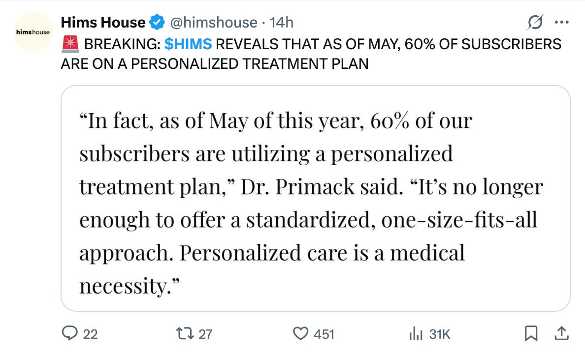 En esta vertical, además, los marcadores que Hims propone en su Test at Home serían de gran ayuda para evaluar la elegibilidad de un paciente para prescribir formulaciones de péptidos como los análogos de GLP-1 (por ejemplo, Semaglutida o Tirzepatida). Esto completría el círculo de su metodología actual.