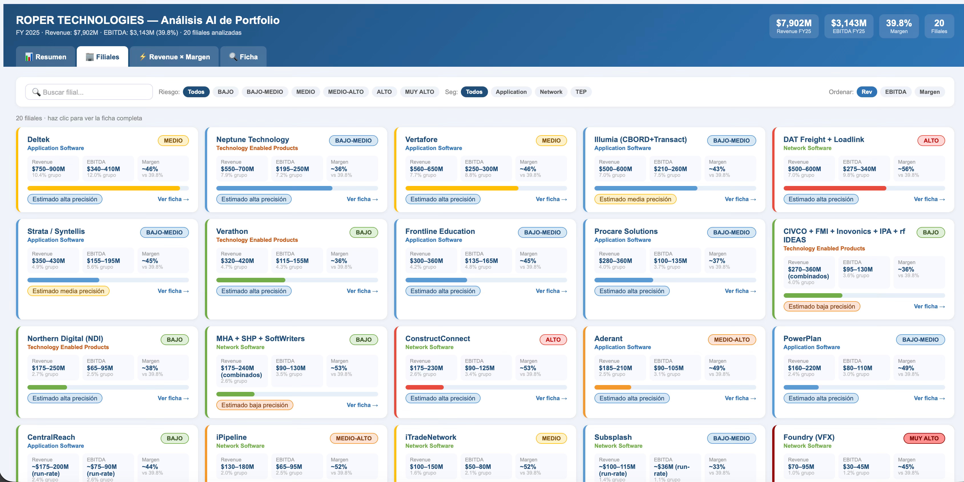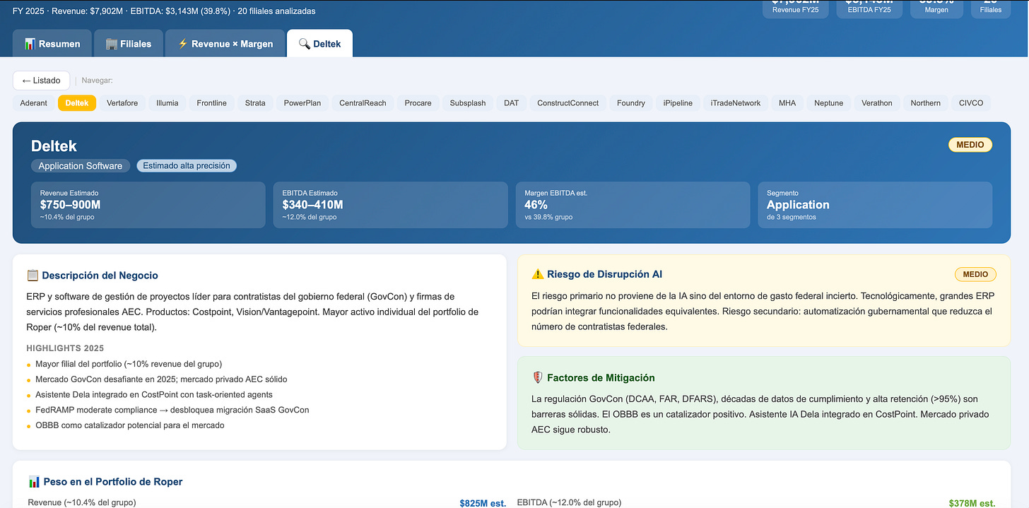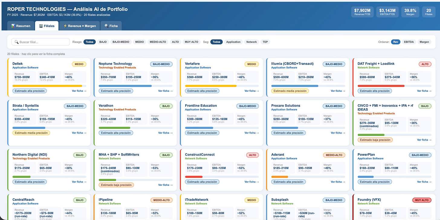 Diría con notable convencimiento que el 99,5% de los inversores en Roper no disponen actualmente de este nivel de detalle sobre la compañía. A día de hoy, este dashboard te permite estimar una valoración por suma de partes en base a cada una de las filiales, algo que intentaré hacer en próximas semanas.