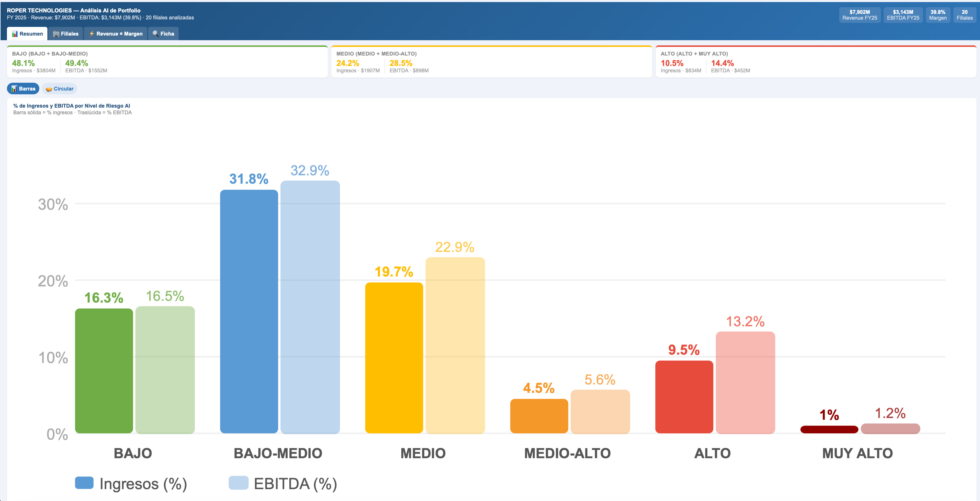 La conclusión personal que extraigo, sumando este análisis a la tesis ya publicada, es que el mercado parece estar valorando Roper prácticamente por el conjunto de sus filiales de riesgo bajo o bajo-medio. Si la IA - como muchos sostienen - no sustituirá al software sino que lo complementará, y teniendo en cuenta que varias filiales de Roper ni siquiera operan en el segmento (recordemos segmentos industriales), la compañía no debería valorarse por una fracción defensiva de su portfolio, sino por la práctica totalidad del mismo.