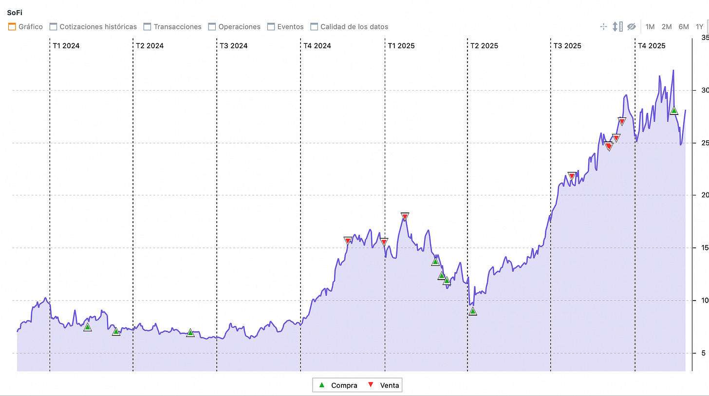 Esta caída growth nos ha dado la oportunidad de aumentar nuestra posición en Sofi tras las reducciones que ejecutamos cerca de máximos. Como en Rocket Lab, el último trimestre de Sofi nos demostró el que es un negocio aún mejor de lo que podríamos imaginar, por lo que en mi modelo su valor intrínseco ha aumentado.