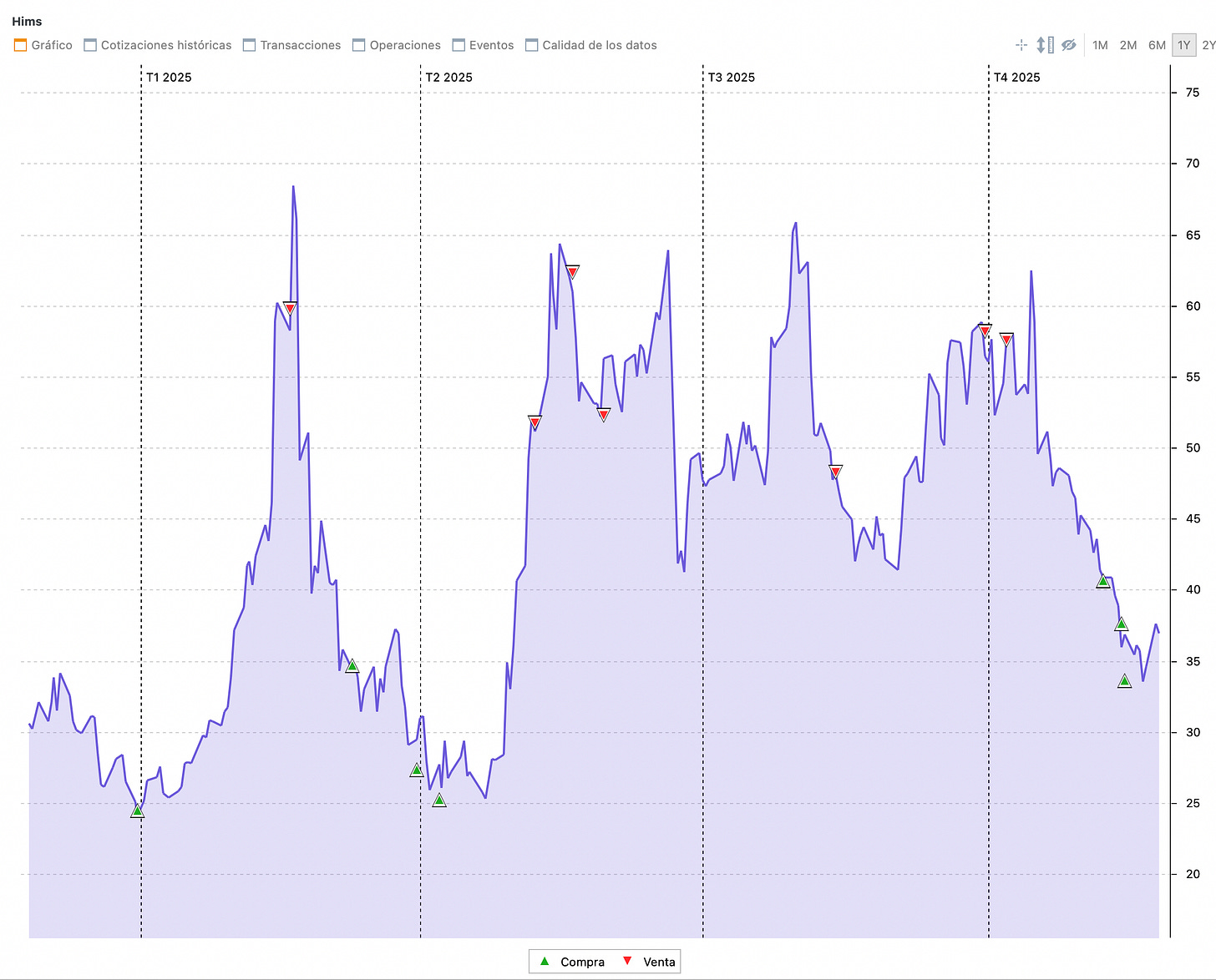 Comenzamos a recortar con fuerza nuestra posición en Hims en cotizaciones de entre 55$ y 70$, ya que consideraba que desde este punto sus retornos a 2-3 años vista eran menores a los perseguidos.