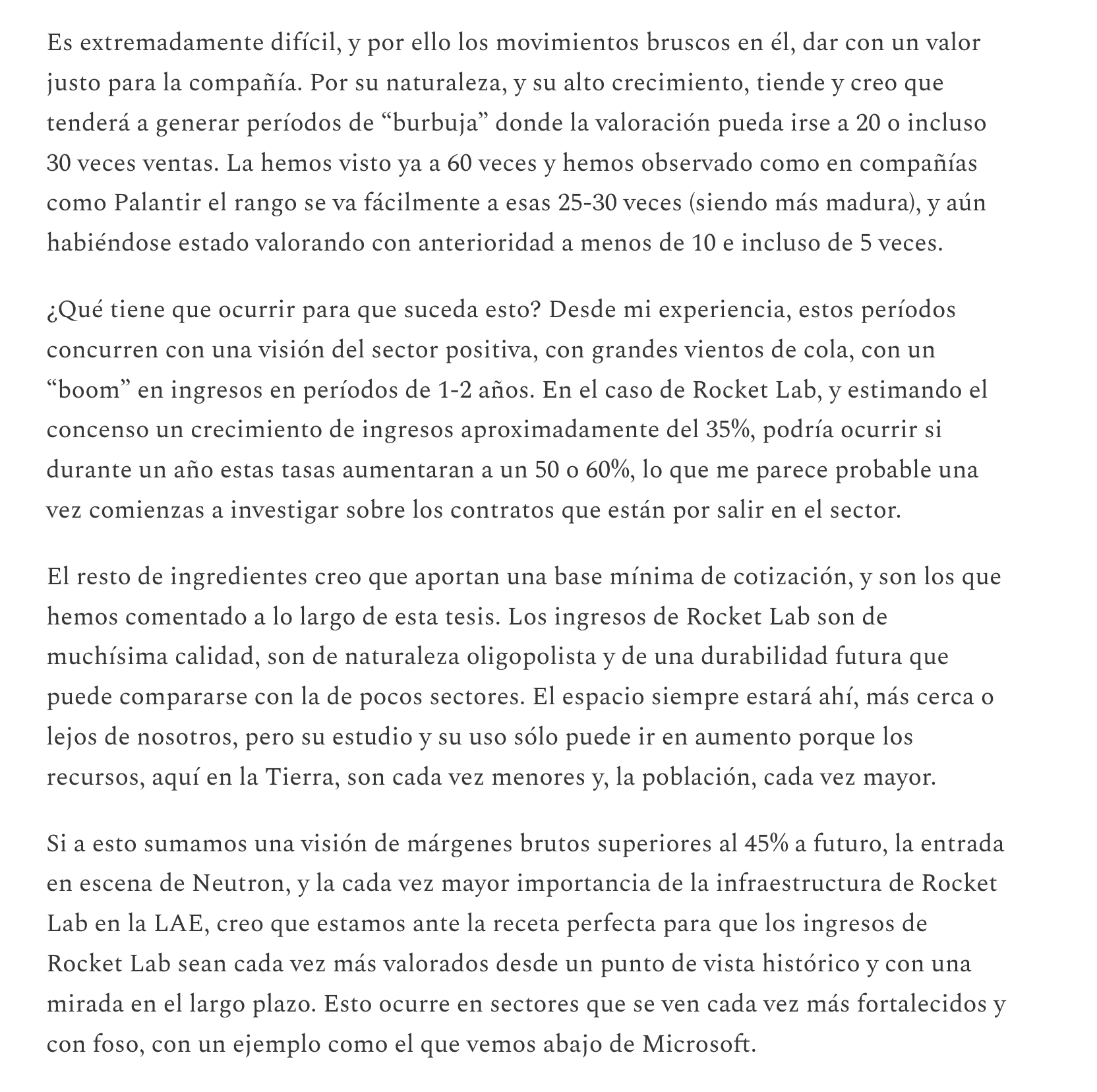 Esta visión para mí se ha fortalecido con el tiempo, y creo que será muy difícil ver a Rocket Lab por debajo de las 15x ventas durante los próximos años.