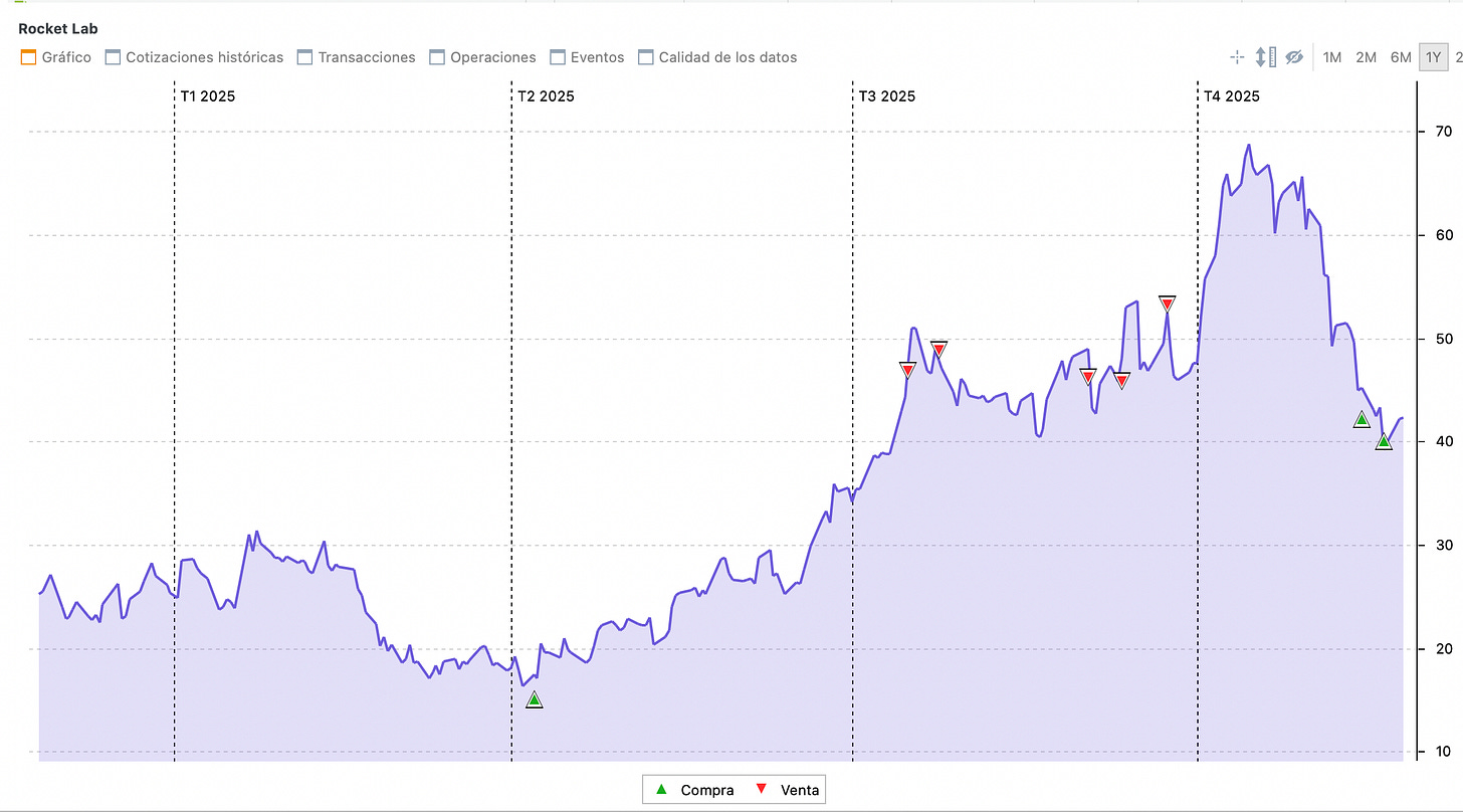 Recortamos en Rocket Lab a precios de entre 46 y 54$. Actualmente hemos aumentado a precios de 40-42$. Si bien esto tendría poco sentido (poca ganancia para tanta operativa), me gustaría explicar las razones.
