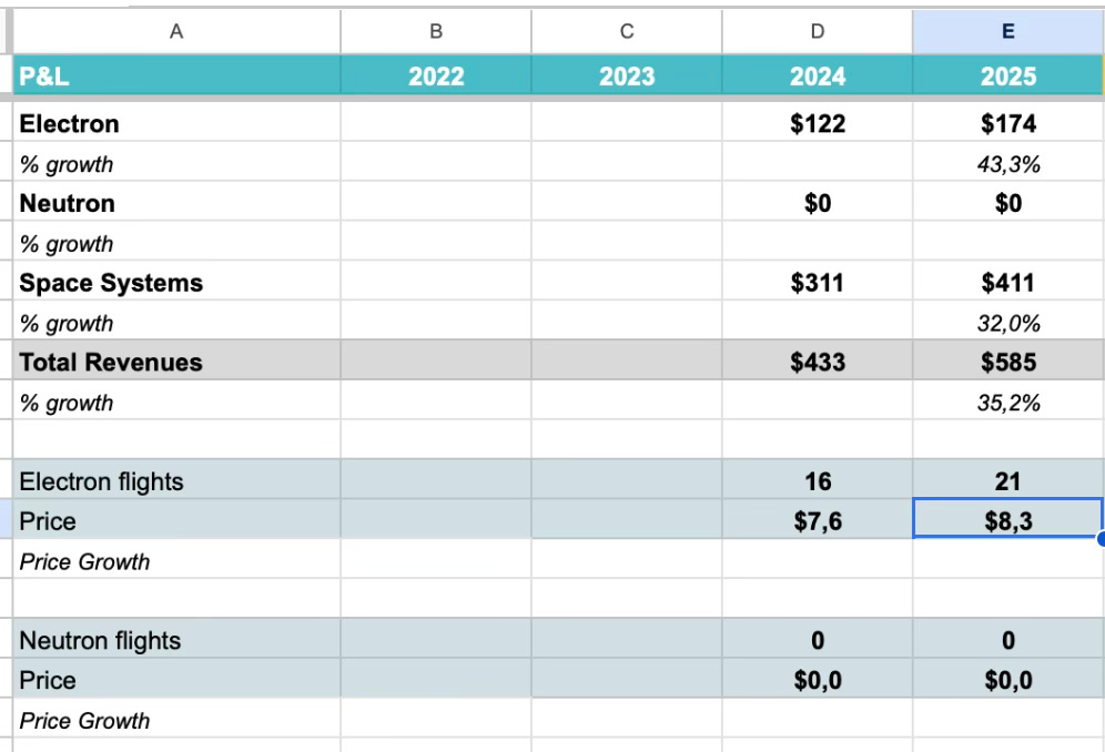 Si pensamos en los números que nos dio Beck, podríamos estimarlos en 30. Como ya vimos en anteriores publicaciones, la hoja de ruta del precio medio por lanzamiento también es positiva: el backlog de Electron está valorado a una media de $8,2m por lanzamiento vs. 7,5m en 2024, con precio previsto en máximo histórico en Q4 2026. Para modelos financieros, Spice dejó claro el mecanismo: