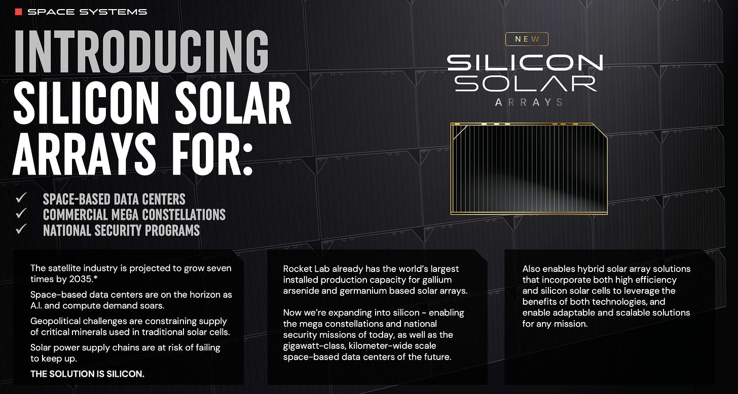 Quizá la mayor novedad y lo que más sorprendió al mercado fue el anuncio de Beck del lanzamiento de arrays de silicio optimizados para el espacio, apuntando a data centers orbitales y mega-constelaciones. Rocket Lab ya tiene la mayor capacidad instalada de producción de células de arsenuro de galio y germanio del mundo; el silicio añade una opción de bajo coste por vatio a escala industrial.