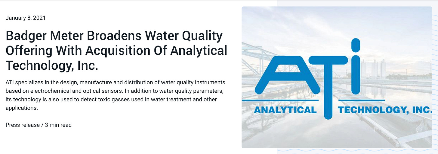Aún más atrás en el tiempo, en 2021, la compañía adquiría ATI (Analytical Technology). Antes de la adquisición, Badger Meter era muy fuerte en medir cuánta agua pasa por la red y en cómo se mueve esa agua. Con ATI, añadió una tercera dimensión clave: qué calidad tiene esa agua en cada momento.