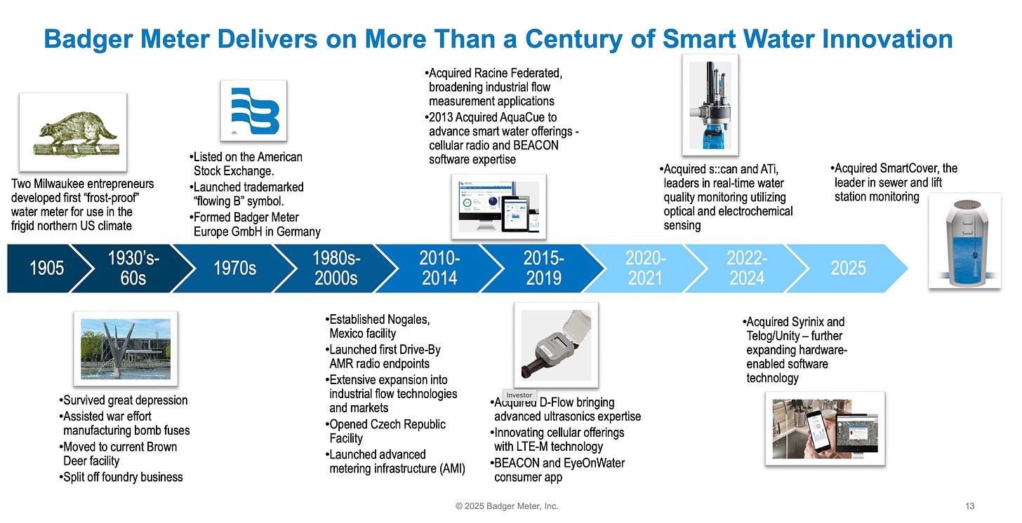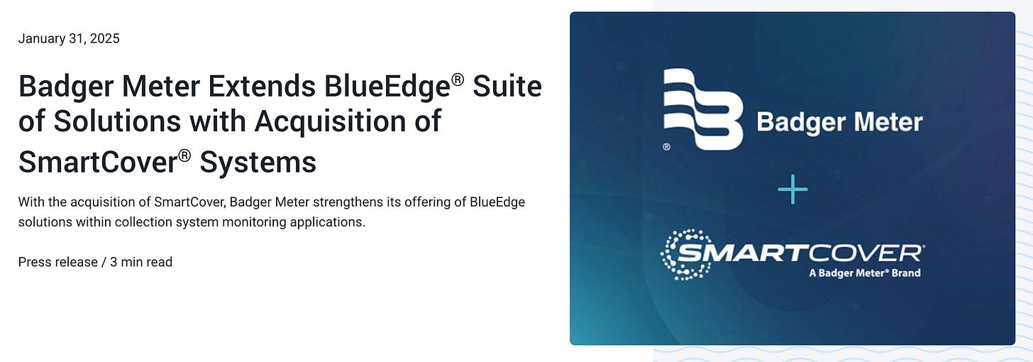 Un buen ejemplo es la adquisición de SmartCover en este 2025 (que ya viésemos anteriormente), especializada en monitorización de redes de saneamiento y estaciones de bombeo. SmartCover no amplía simplemente el catálogo de productos, sino que extiende el alcance de Badger Meter desde el agua potable hacia el ciclo completo del agua, incluyendo aguas residuales. Esto permite a la compañía presentarse ante las utilities no solo como proveedor de medición, sino como socio integral en la gestión de infraestructuras críticas. Además, SmartCover aporta una base de ingresos SaaS con márgenes elevados (una vez integrada) y recurrencia clara, acelerando el desplazamiento del mix hacia software.