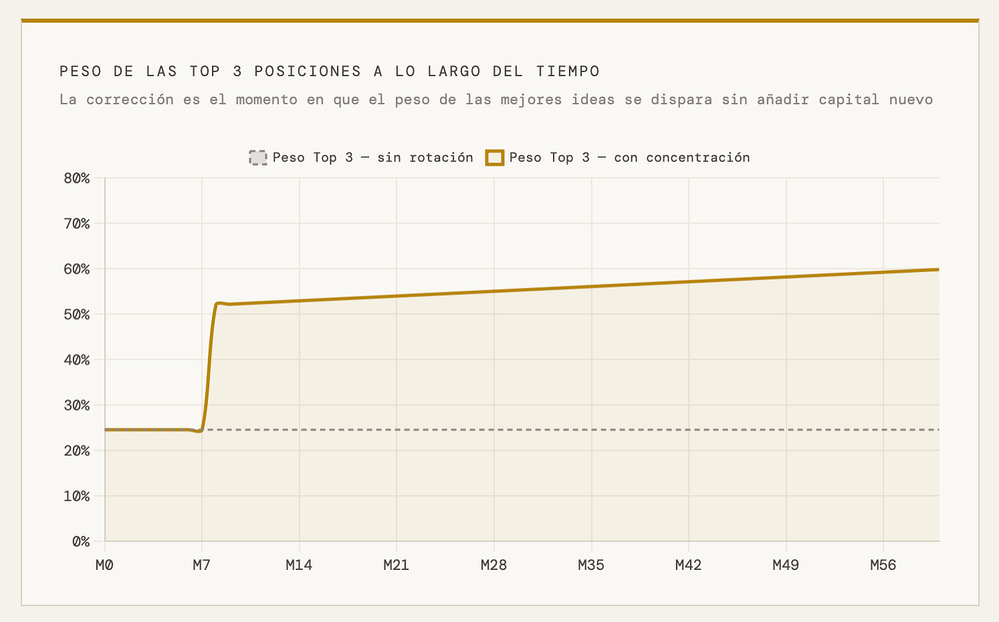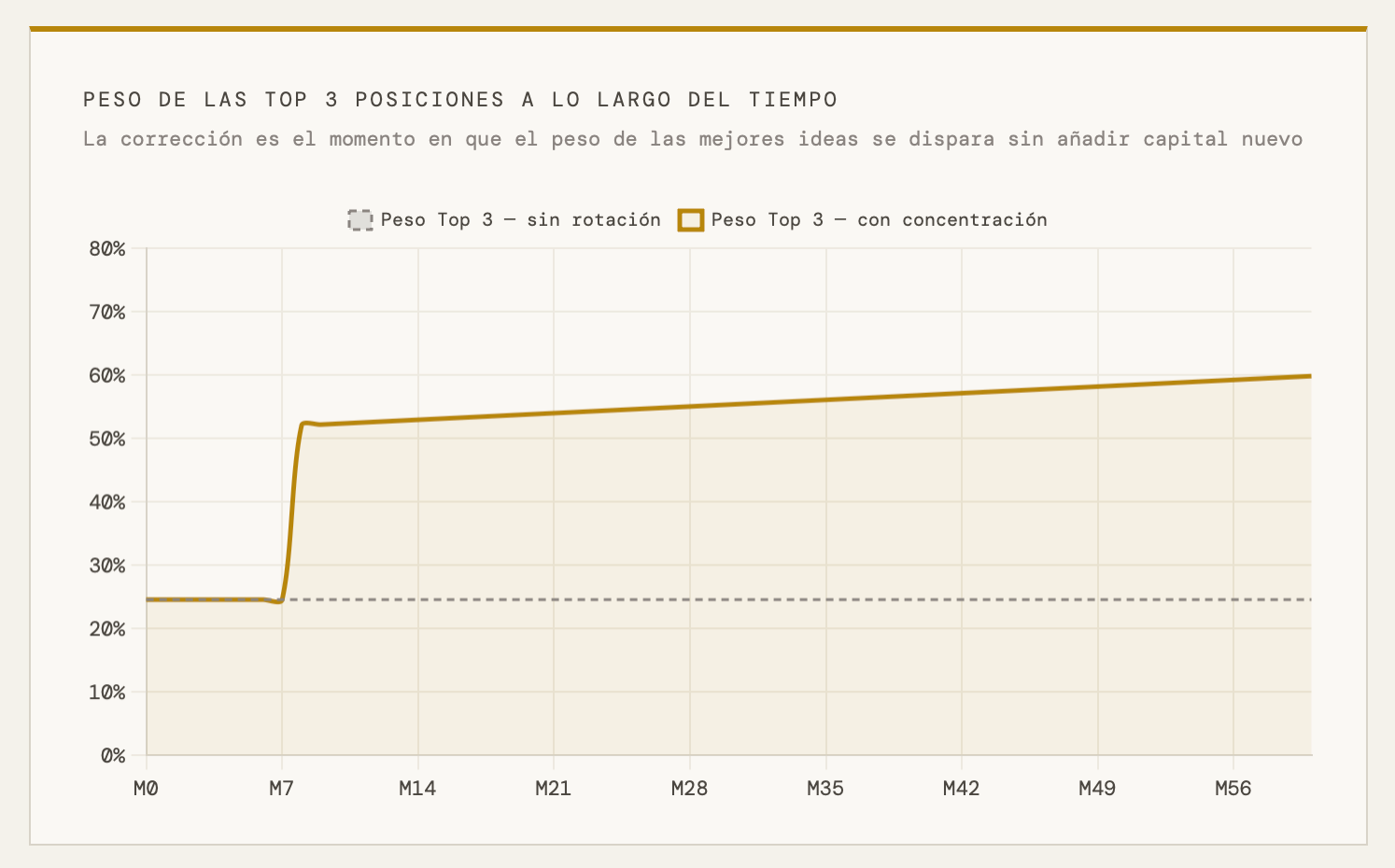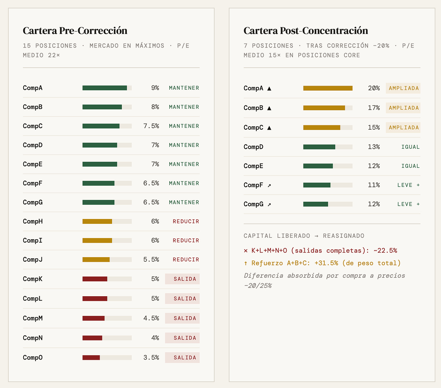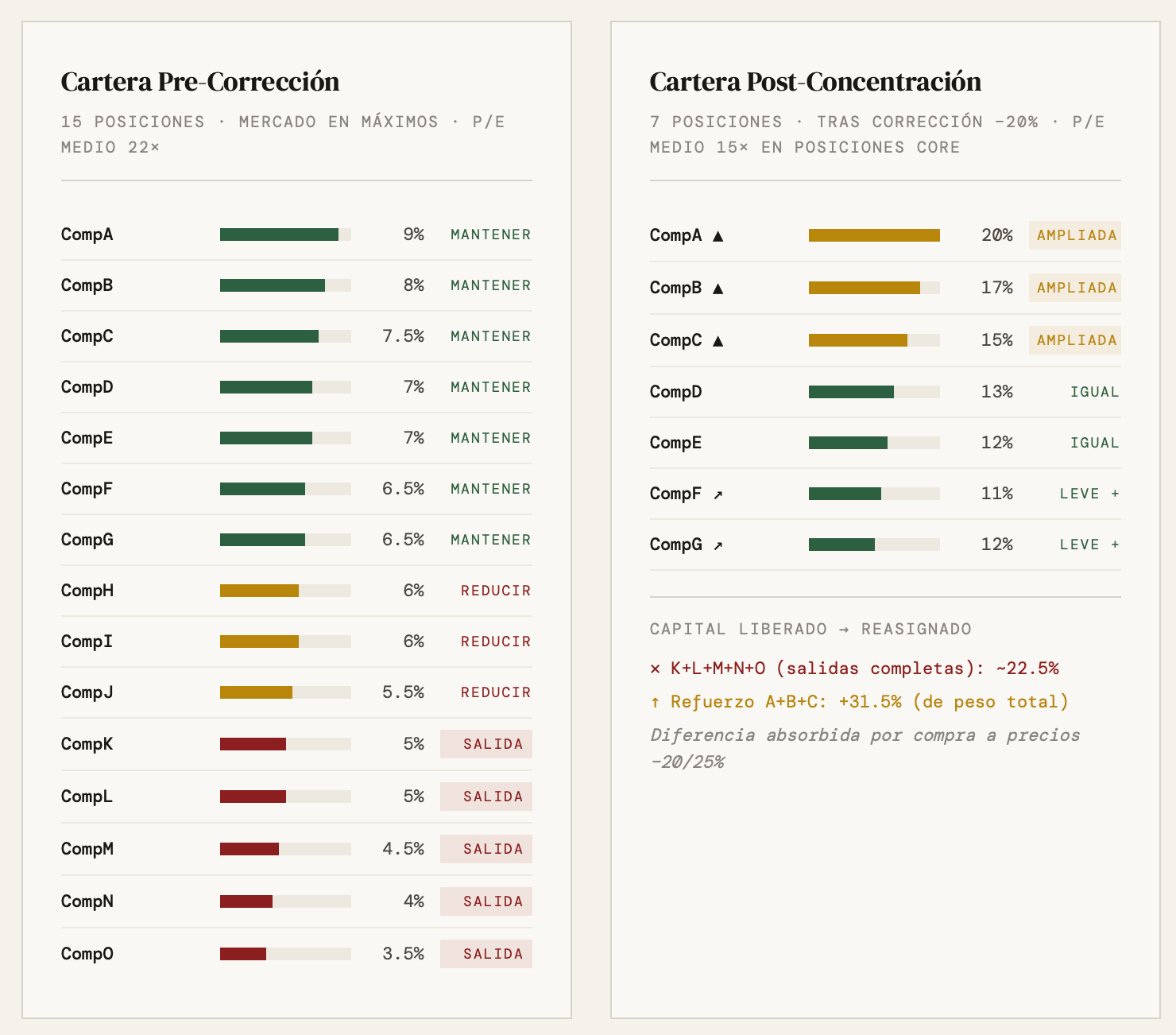 El resultado: pasas de una cartera de 15 posiciones con pesos del 6-9% cada una a una cartera de 7 posiciones donde tus tres primeras ideas tienen pesos del 15-20%. Y lo has hecho sin añadir un euro de capital nuevo, comprando exactamente donde tienes más convicción y vendiendo donde tienes menos, en el momento en que la diferencia de valoración te es más favorable.
