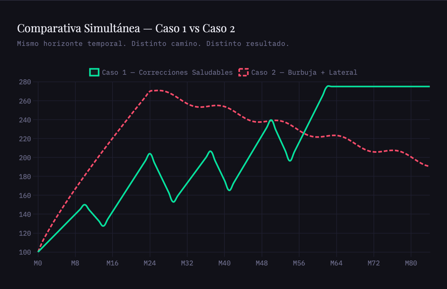 La línea verde llega antes, más arriba y con más títulos acumulados. La línea roja llega tarde, por debajo y habiendo comprado casi todo a máximos de múltiplo. El Caso 2 gana la batalla psicológica. El Caso 1 gana la guerra patrimonial.