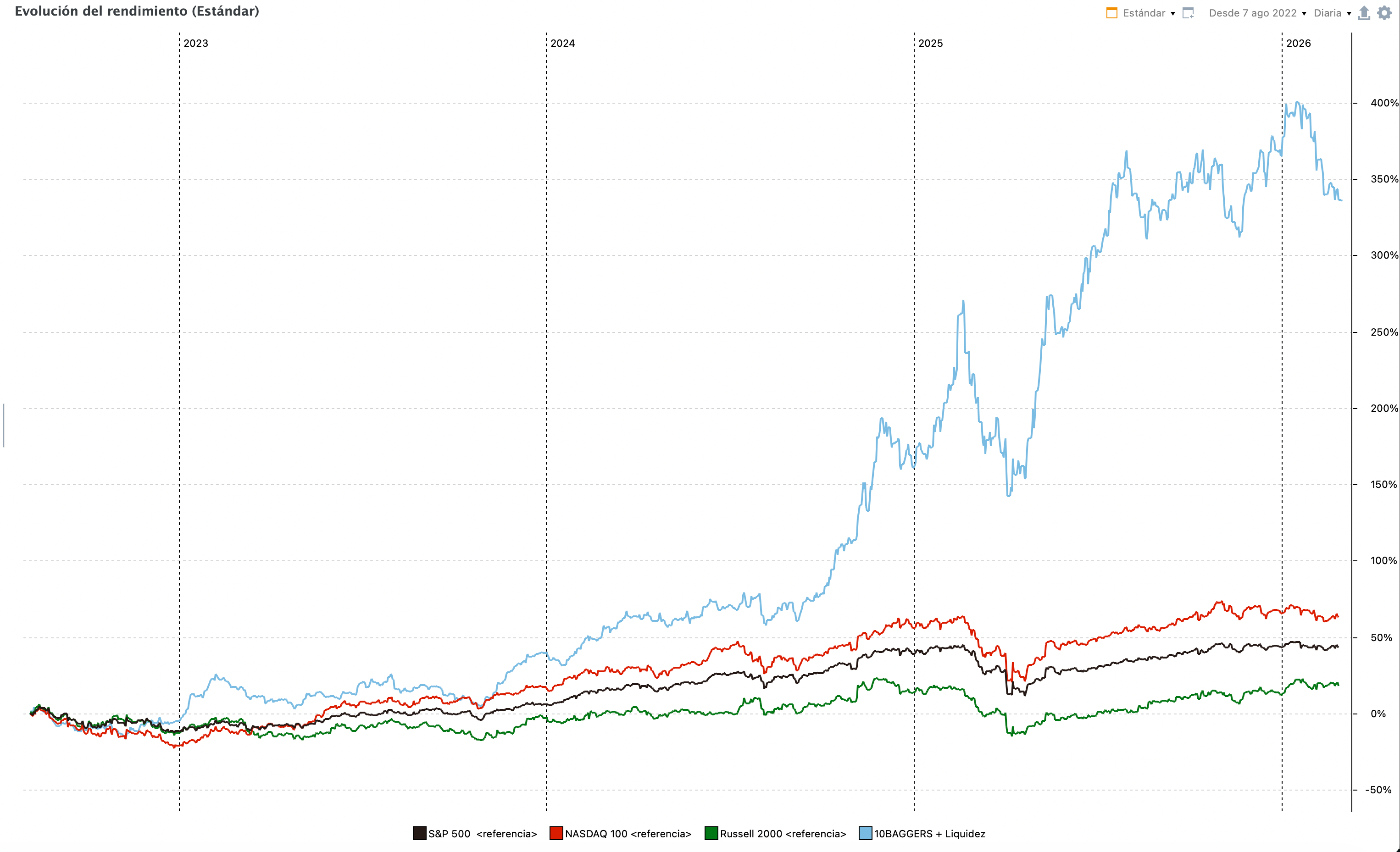 La segunda es la exposición gradual a la incomodidad. Cada corrección que atraviesas sin vender es un entrenamiento. La primera vez que tu cartera cae un 15% y no vendes, es difícil. La segunda, menos. La tercera, empiezas a ver el patrón. La cuarta, directamente la esperas con los brazos abiertos. No es estoicismo forzado, es memoria muscular financiera. Tu cerebro aprende que la caída no mató al inversor anterior, y esa memoria reduce la respuesta de amenaza en el siguiente episodio. En la imagen de debajo puedes ver cómo mi cartera bajó un 40% en apenas meses en 2025, yendo desde un +40% YTD a un 0%. En los últimos momentos llegué a dudar, y no lo pasé bien, para que engañarte. Al principio era una oportunidad y luego se convirtió en amenaza, pero sabía que había un plan y que los negocios estaban en el punto en que debían estar. La proliferación de catastrofistas y estímulos exacerbados me puso de frente al Sistema 1 de Kahneman. La realidad es que todo el proceso que te cuento en esta publicación me sirvió para, mediante aumentos de posición estratégicos y compras de nuevos valores, llegar a un final de año donde la subida compensó todo lo anterior. Mi mente había sufrido durante semanas para que, en el largo plazo, ese período jamás hubiese ocurrido (recuerda al Tottenham).