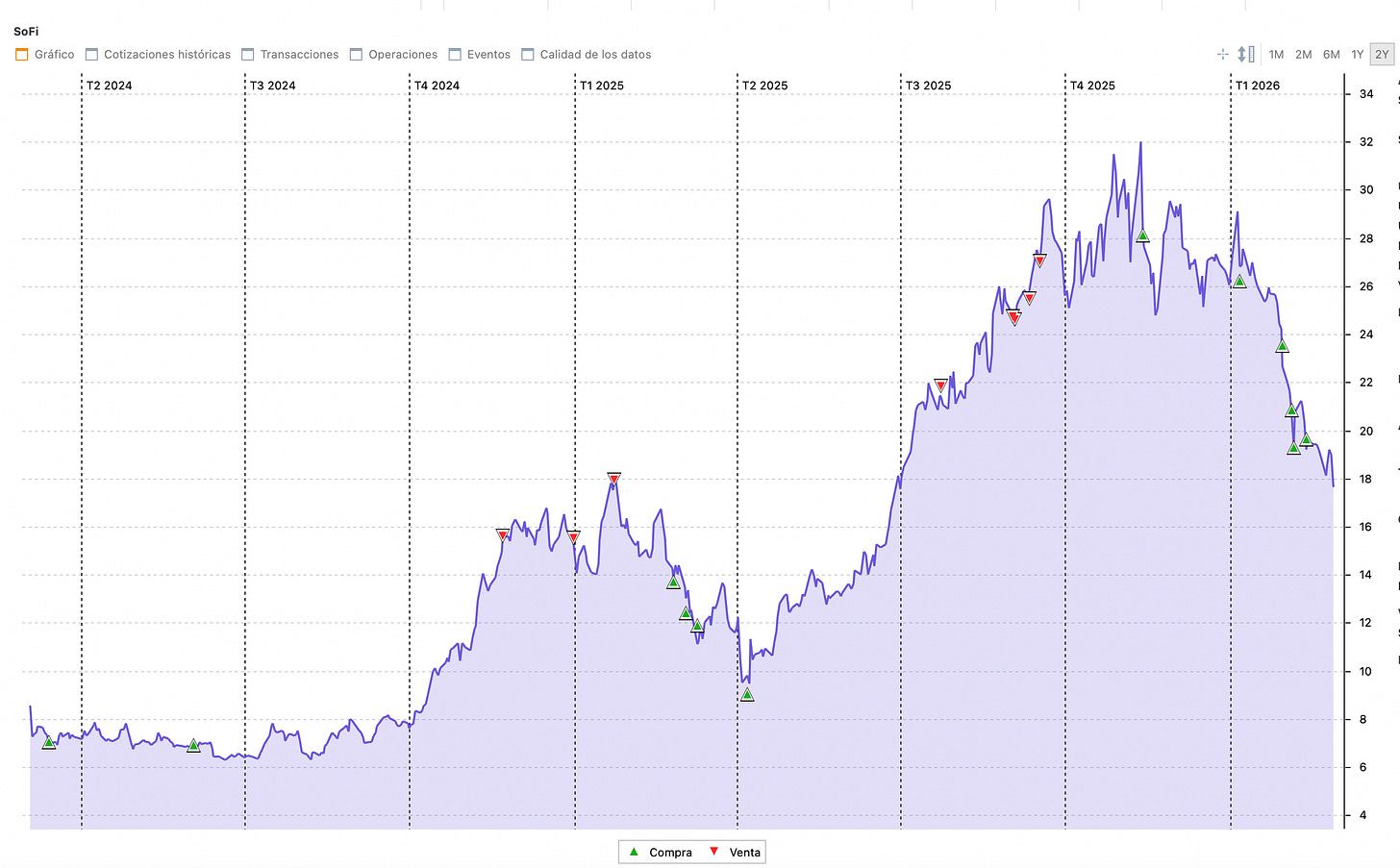 La tercera, y la más poderosa, es cambiar el marco de referencia. En lugar de medir tu cartera contra su valor máximo reciente (lo que siempre produce dolor), mide cada posición contra el valor intrínseco estimado del negocio. Si SOFI vale $35 a largo plazo y cotiza a $17, no estás perdiendo un 46% desde máximos, estás comprando con un descuento del 51% sobre valor. El mismo dato, encuadrado de otra manera, activa una respuesta emocional completamente distinta. Esto no es autoengaño, es simplemente elegir la métrica correcta.