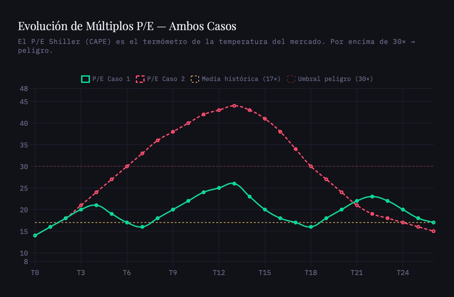 En el Caso 1, el P/E oscila entre 14× y 26×. Eso es un mercado normalizado. Cada corrección devuelve el múltiplo a zona de compra. Cuando vuelve a subir, no solo sube el precio, también se re-expande el múltiplo, amplificando el retorno. O lo que es lo mismo, las correcciones del 10, 20 o 30% son aquellas que permiten disfrutar de un mercado saludable. Y un mercado saludable, históricamente, es alcista a largo plazo.