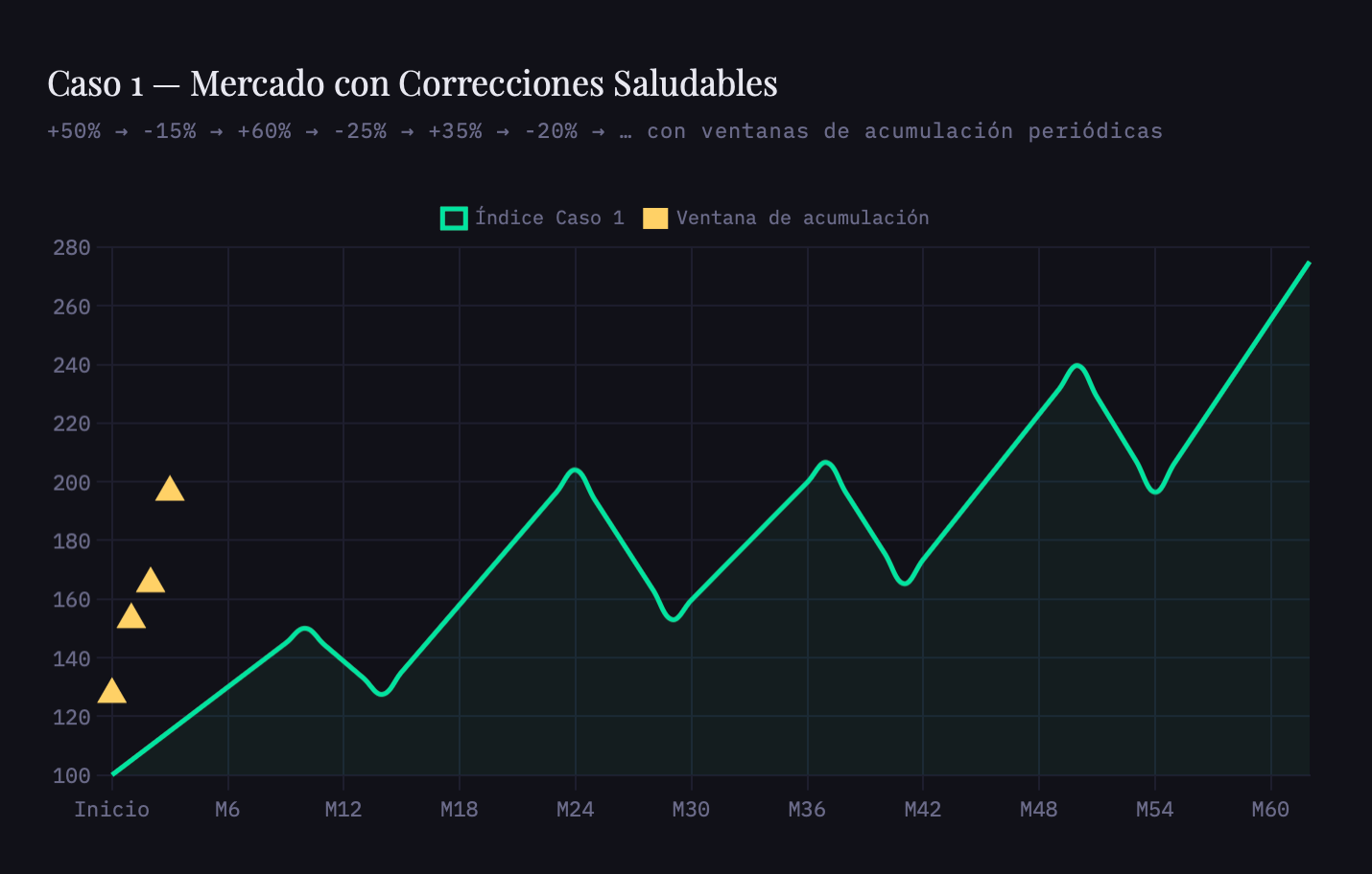 Caso 1. El mercado sube +50%, corrige -15%, sube +60%, corrige -25%, sube +35%, corrige -20%. Un ciclo con respiración, lógico, con oportunidades.