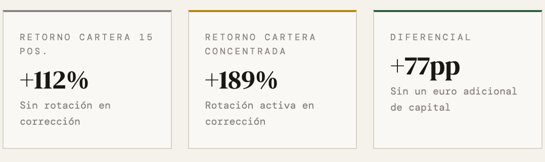 Con todo, ahí, en ese momento, está la palanca: la corrección crea diferencias de valoración relativa entre tus propias posiciones que en un mercado en máximos nunca existen.