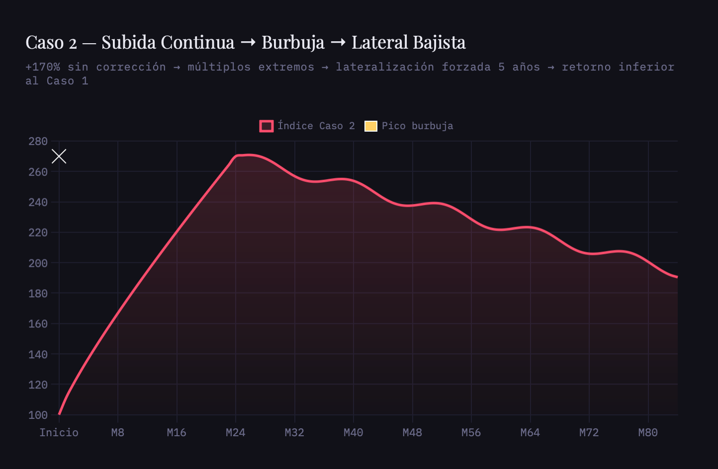 Sube +170% sin pausa. Nadie se queja, todos celebran. Cuando el P/E llega a 40–45×, el mercado no tiene margen para seguir subiendo. Lo que viene después no es un crash dramático que aparece en todos los titulares (o sí), es algo mucho peor: cinco años de absolutamente nada. Capital atrapado. Retorno total en el mismo horizonte temporal: aproximadamente 94%. Las burbujas tienden a reflejar en sus valoraciones sobrecalentadas un mismo reflejo tras su rotura, convertidas en valoraciones excesivamente castigadas.