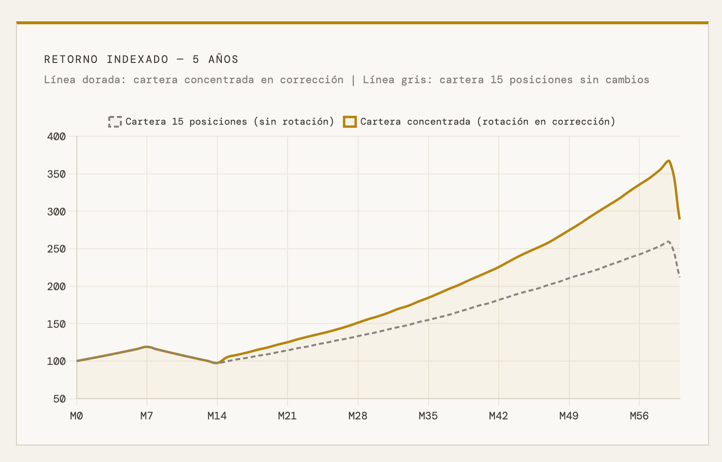 El efecto en el retorno a 5 años es no lineal. No porque hayas hecho algo especialmente sofisticado, sino porque cuando el mercado recupere, lo hace con más fuerza en exactamente los negocios que más has cargado (quien cae un -5% en un mercado -2% si los fundamentales no se han deteriorado subirá un +7% cuando el mercado lo haga en un +2%), y lo hace partiendo de un precio medio de coste que en condiciones normales no habrías podido conseguir.