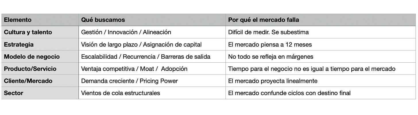 Por último, te dejo esta pequeña tabla para que puedas reflexionar sobre tus propios valores en cartera. Un consejo adicional es que intentes pensar en lo que el mercado no se espera, más que en lo que el mercado se equivoca. Te pongo un ejemplo rápido en Hims: no es si GLP-1 sí o GLP-1 no (visión actual del mercado), es todo lo que llegará y que hará que ese debate envejezca realmente mal (opinión propia que no tiene que ser cierta).
